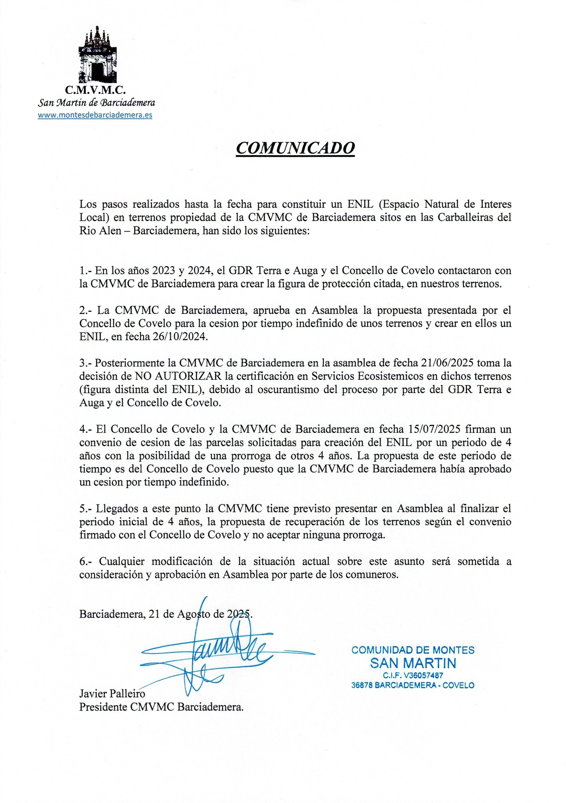 Debido a las diversas preguntas y peticion de aclaraciones de comuneros y algunos vecinos de la parroquia de Barciademera sobre la informacion que aparece en la pagina web del Concello de Covelo referente a la figura del ENIL de las Carballeiras del Rio Alen - Barciademera, promovido por el GDR Terra e Auga en su Proyecto Mixturando, la CMVMC de Barciademera, emite el siguiente comunicado:
